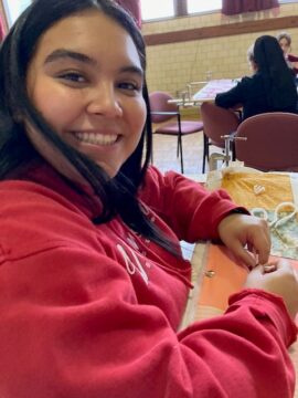 “We had a fantastic day at Holy Family Convent. I was so proud of our students! They were polite and respectful and participated in Sister Pam’s discussions with enthusiasm. They helped finish three quilts that will be sent to Africa. The visit gave the girls a glimpse into the lives of the sisters. We could see that they are real human beings with parents and siblings, iPhones, and cars, who watch TV, craft, and maybe bend a rule or two (just a bit…and they have lots of confessionals available). It took away some of the mystery surrounding religious life. Sister Pam is very down to earth and easy to talk to. My favorite take away from the day was that we don’t have to be serious and somber to be holy…just be nice to the people we see each day, even when it’s not easy to be.”